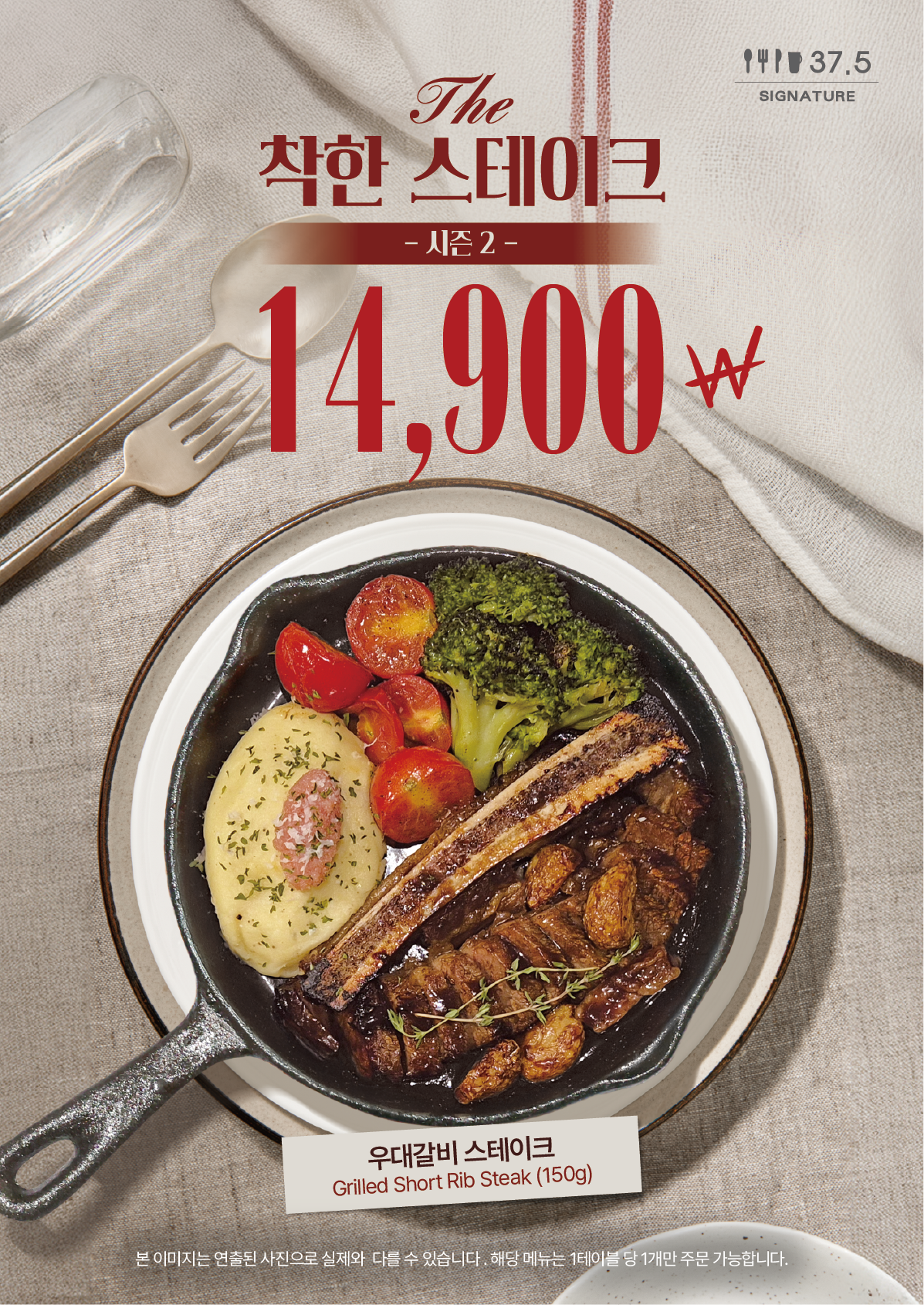 특제 갈비양념으로 구운 부드러운 소갈비에 레드와인 소스, 구운 야채, 명란 매쉬 포테이토를 곁들인 37.5의 특별한 1인 스테이크